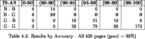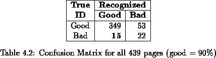 The test dataset was processed by the classifier. In this experiment, a ``good'' page is defined as a page where the median OCR accuracy is equal to or higher than 90%. Appendix A presents the complete results of this test. Table 4.2 shows the confusion matrix for this test. The classifier worked as expected in most cases, even though it made 15 misclassifications of ``Bad'' pages as ``Good''.