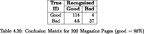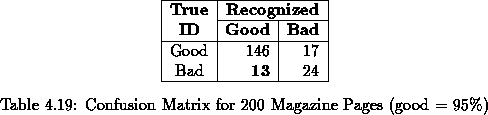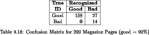 All 200 pages were processed by the classifier without pre-filtering. The confusion matrices for ``good thresholds'' of 90%, 95%and 98%are shown in Tables 4.18, 4.19, 4.20, respectively. Appendix B contains the complete classification results for all 200 pages.