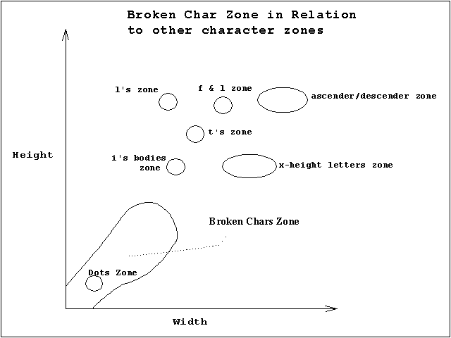 It is important to note that the broken char zone is designed to collect all small connected components. These small connected components are mostly the product of broken characters but can also be dots and, in small typesizes, other small legal characters. From a second look at Figure 3.10, it is observed that the location of the ``Dots zone'' is completely inside the broken char area. This means that all the dots in the page, such as a period and the dot of 'i', will generate connected components that will fall inside the broken characters zone.